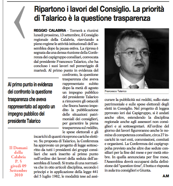 - Il Domani della Calabria – P.5 del 9 Settembre 2010