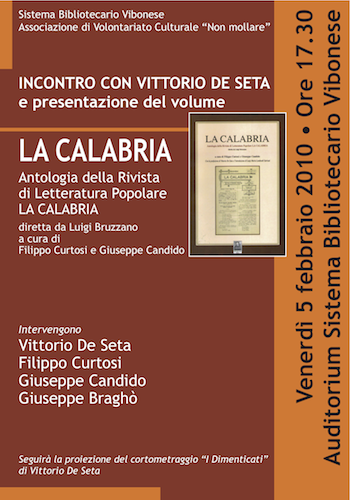 Lo scorso 28 ottobre, Vittorio De Seta, ha voluto farci l’onore di redigere la prefazione per “La Calabria”, una raccolta di canti sacri, leggende, canti popolari,tratti dall’omonima rivista di letteratura popolare edita in Monteleone, dal 1888 al 1902 e che gli scriventi stanno curando e stiamo per pubblicare.